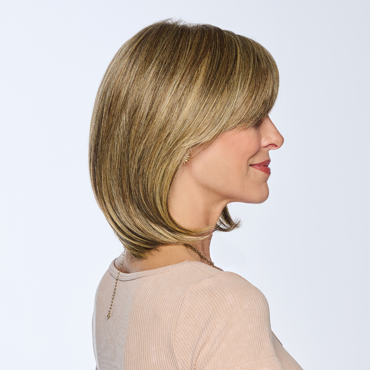 A customer request, this modern bob with a long bang that can be customized as you like. Brush the bang straight down and split in the center, sweep to the side or trim to be wispy or blunt. Style the bob turned under or flipped up. Change it up to suit your mood!