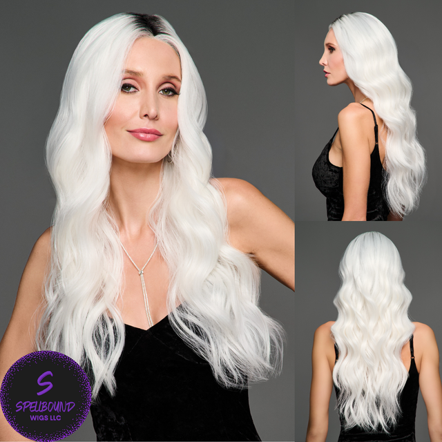 Otherworldly and enchanting. Cool white waves flow softly to mid-back like fresh snowfall. A natural, dark root grounds the icy tone with stark contrast, adding depth and reality to the fantasy. The magical look you love – no bleaching or commitment required.