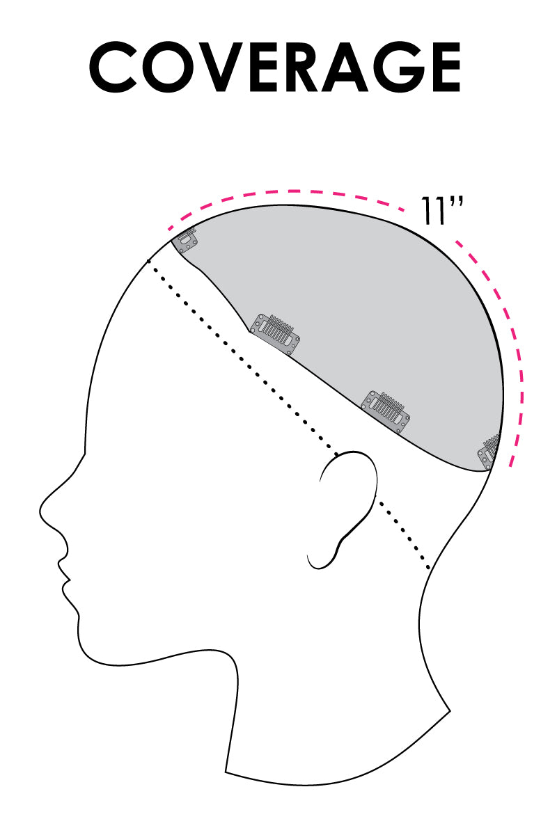 Designed with the comfort of a 100% hand tied stretch base, this long Remy human hair volumizer is worn over the entire crown, providing the most coverage of any clip in topper.