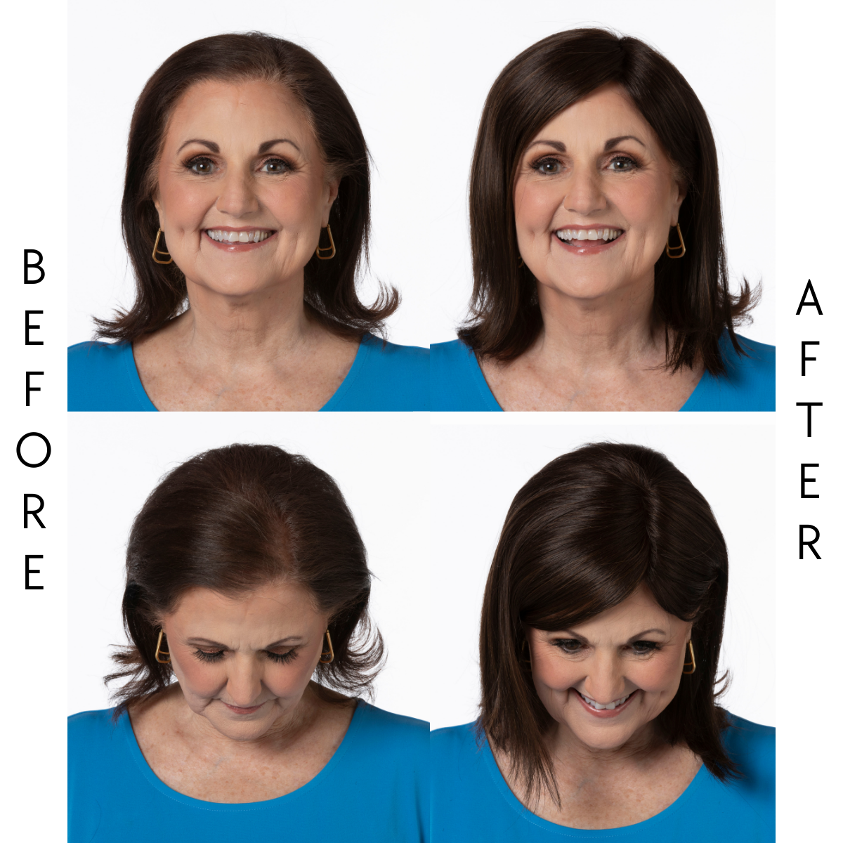The Toni Brattin Grand Topper Hair Piece is uniquely designed for complete coverage of the entire crown of the head, and addresses the most difficult to hide hair loss and thinning hair issues. The custom designed crown and back provide total coverage for even the worst thinning areas. The grand topper attaches effortlessly, fits comfortably and securely and is virtually undetectable – providing the ultimate in life-like wear. With its ever so subtle crown part - the Grand Topper looks and feels like natural, healthy hair. Secured with pressure sensitive snap clips, the Grand Topper blends with your natural hair for both coverage and style-ability. Ideal for a new style, or a quick and easy answer to a bad hair day.