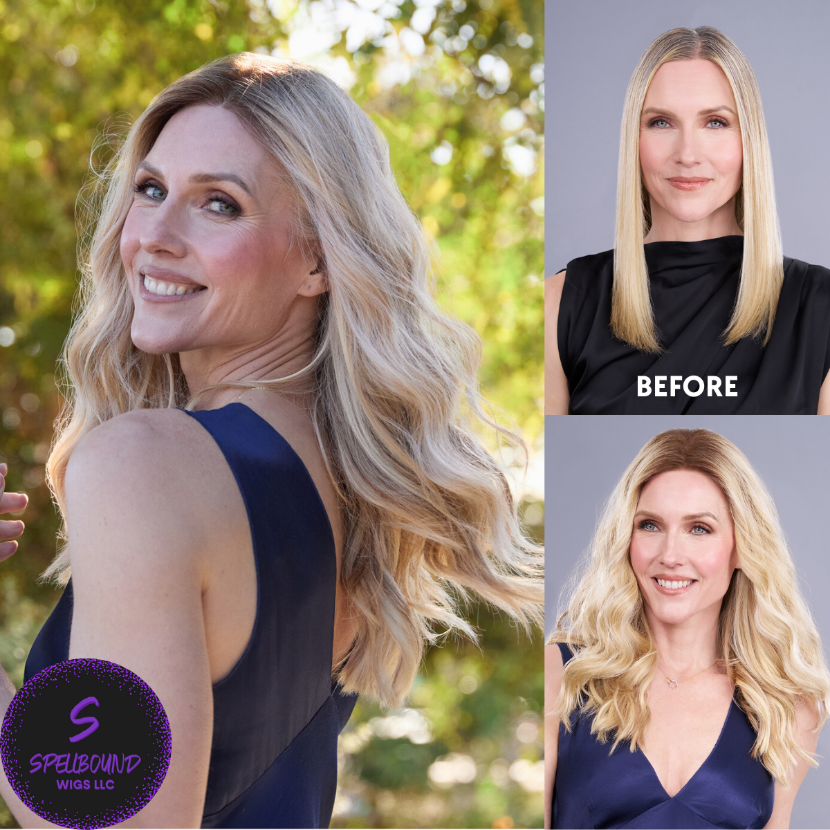 Crafted with heat friendly fiber, the Top Trend Lace HD Wavy 18” topper offers soft, flowing waves with superior coverage and versatile styling. Perfect for mid to progressive hair loss, the extended SmartLace™ front delivers an undetectable hairline, while the double monofilament top allows for flexible parting without exposing the front clip. A machine-wefted back adds density and six secure clips ensure a comfortable, reliable fit. This heat friendly topper holds its natural wave—just scrunch to refresh the curl pattern after washing.