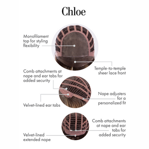 • Mono top, Temple to temple lace front, Velvet lined ear tabs, Extended velvet lined nape, Combs, nape adjusters