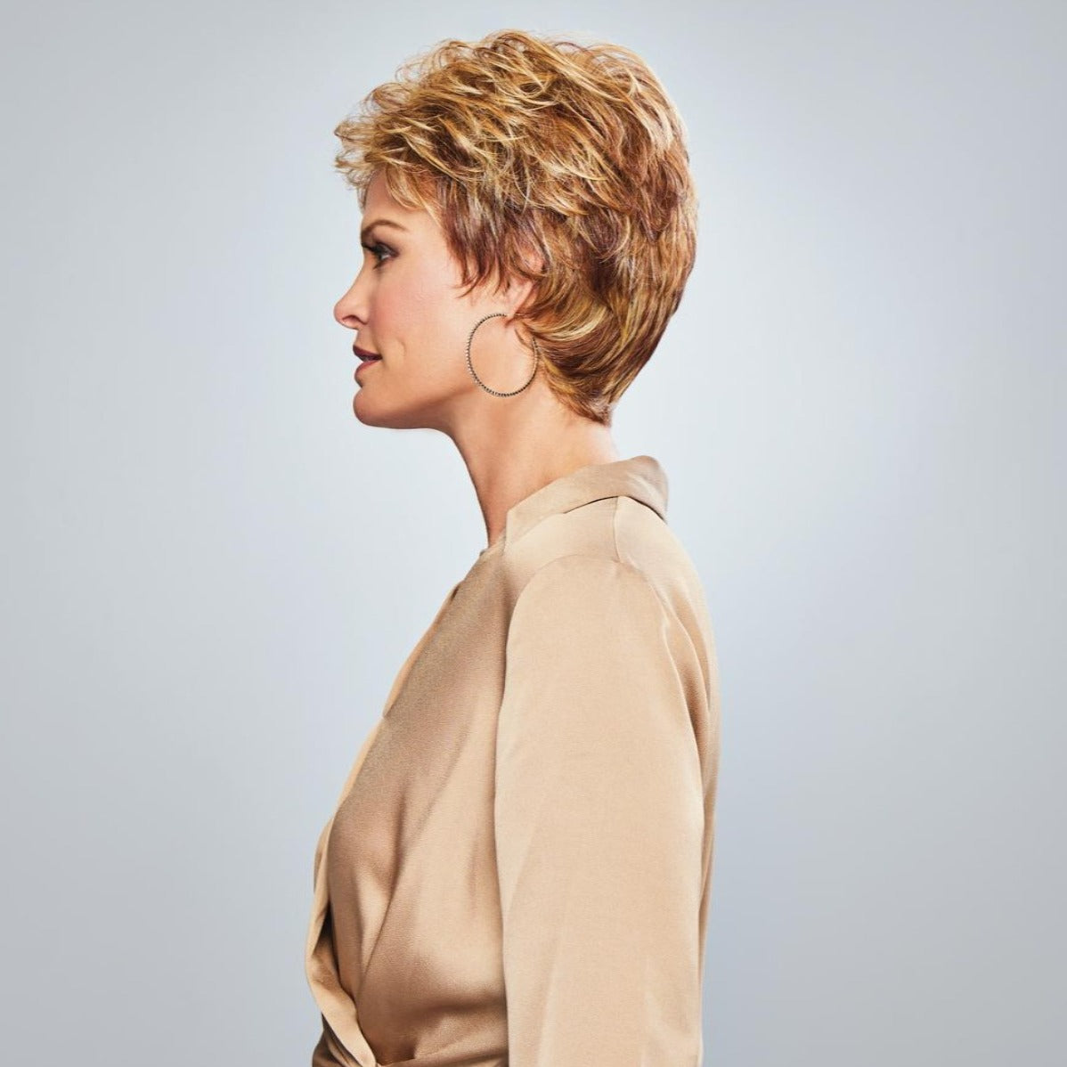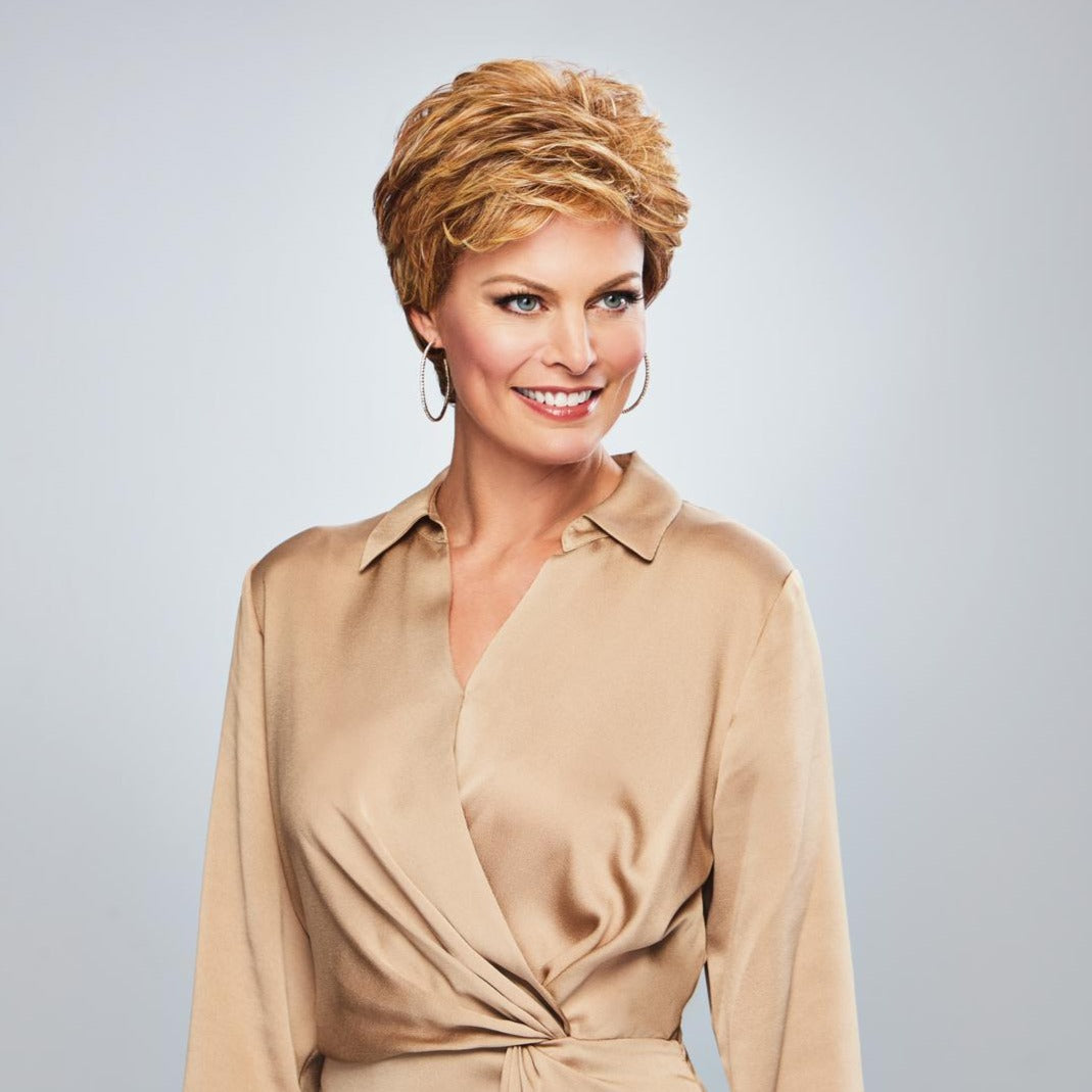 All over gently waved layers give this style sophisticated volume while softly framing the face. Delicately sculpted bangs give her the option of wearing the hair onto the face or swept away. This style also looks great with