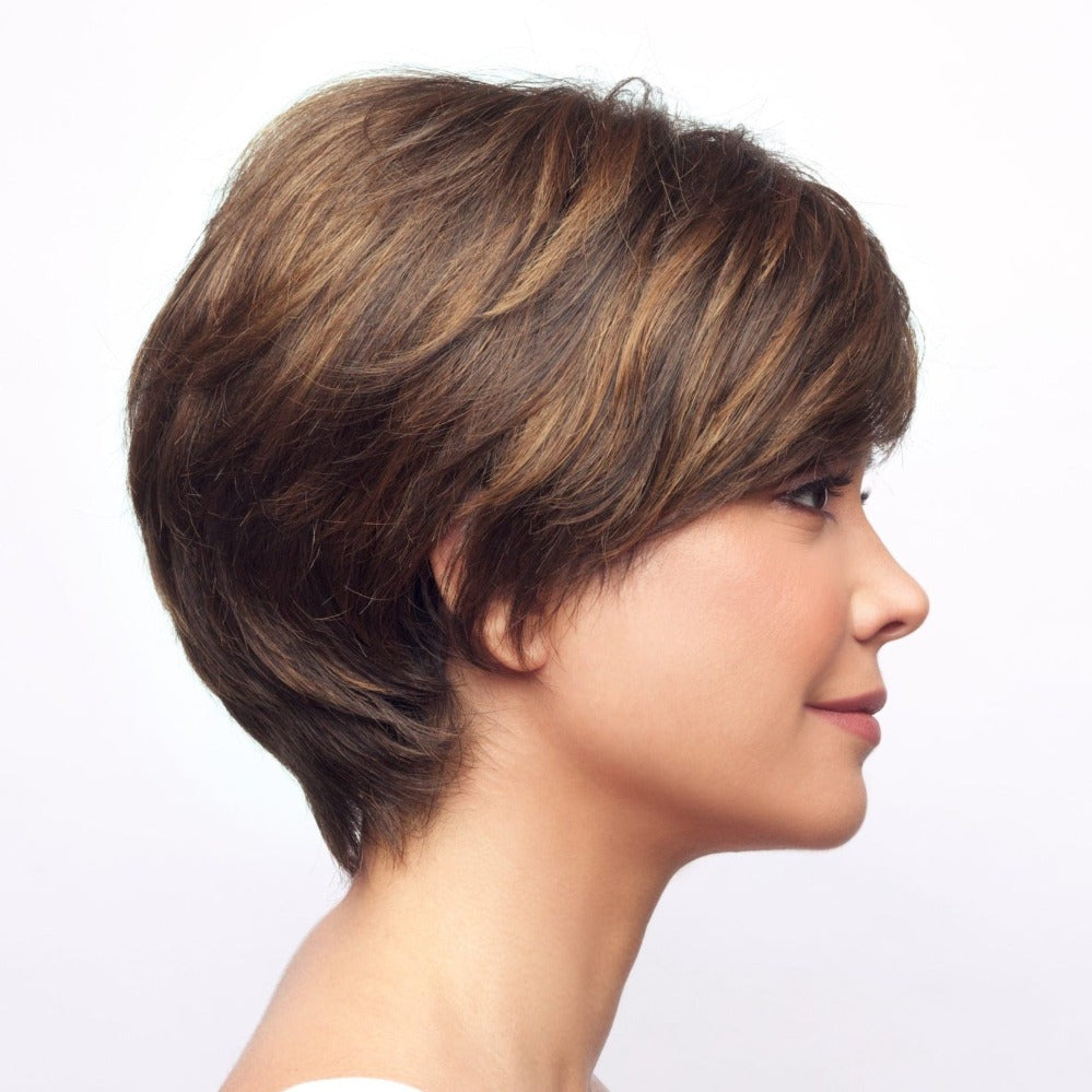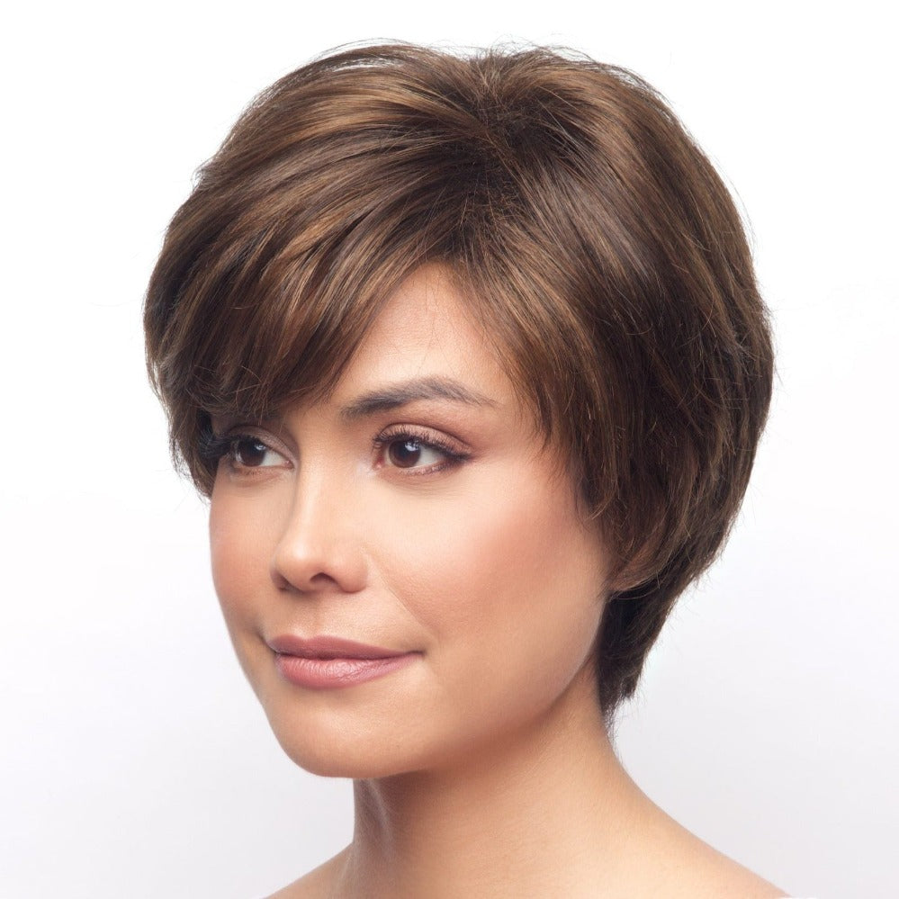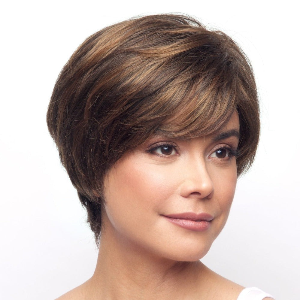 Megan from our Noriko Collection is a short-length synthetic wig. This straight ready-to-wear wig is a semi-wedge bob with tapers in the back. This style will leave give you a soft, wispy effect that’s undeniably chic. Megan is machine made with adjustable tabs in the back nape area to allow a more comfortable fit. The result is a comfortable fit with a natural look that is both fashionable and easy to wear.