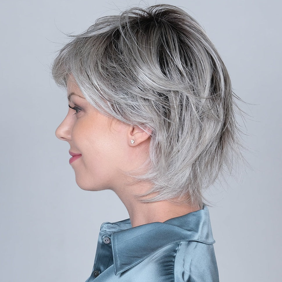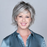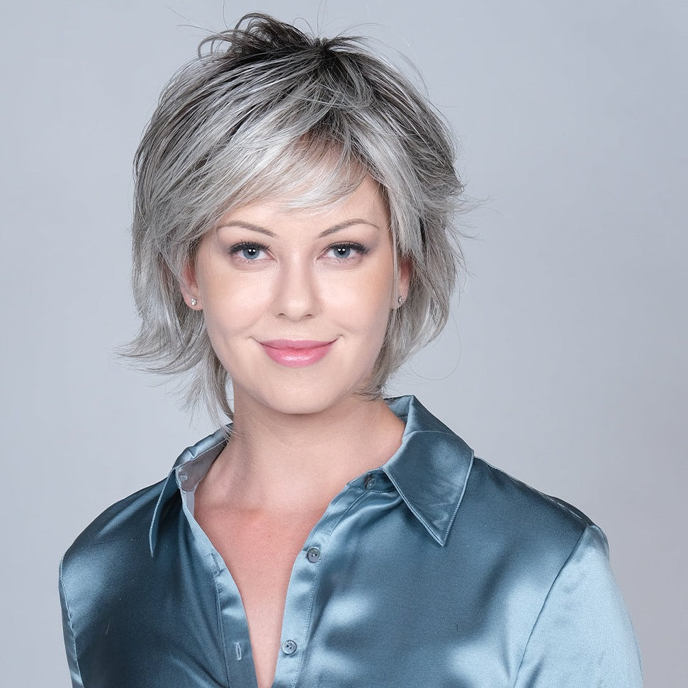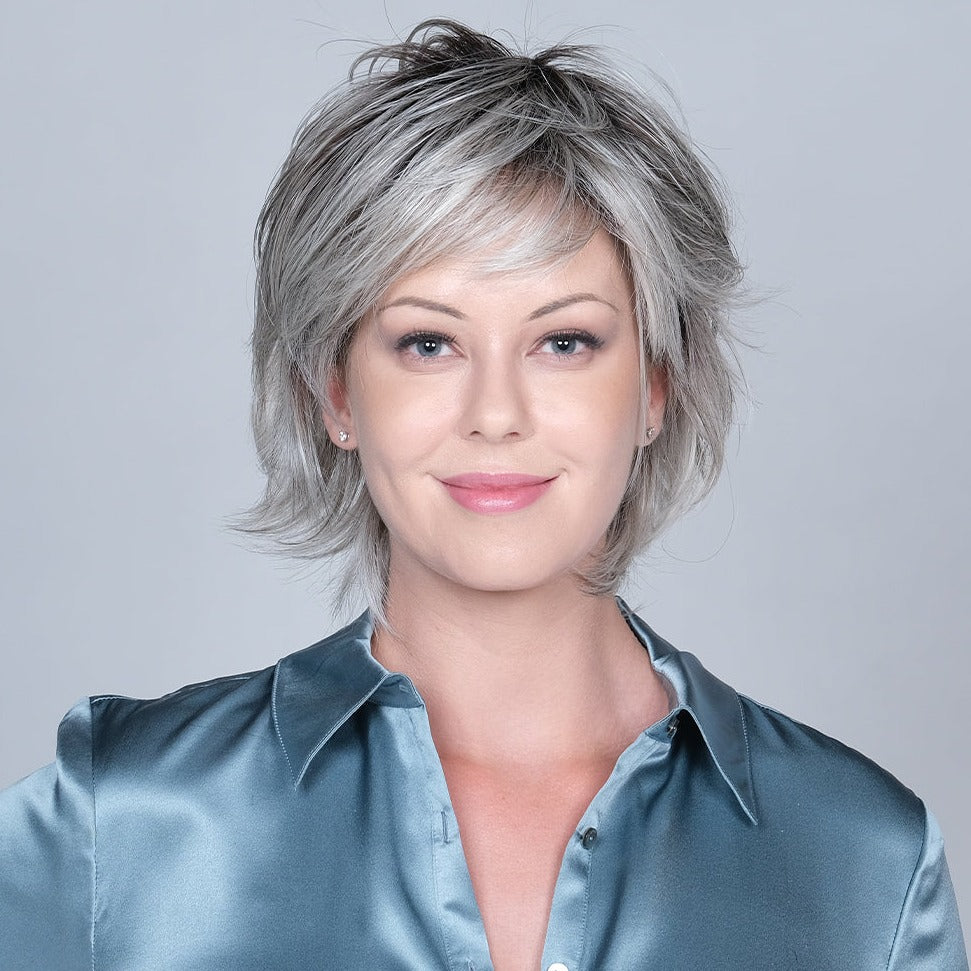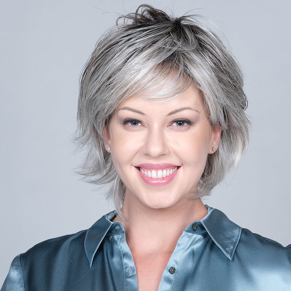 A perfect balance of sweet orange and sophisticated champagne. A face flattering bob with feathered layers and wispy ends creates razor-end pieces around the face. This refined and sassy tousled bob with choppy layers and side fringe is a perfect choice for an early morning mimosa or an evening champagne cocktail. The lace front and partial monofilament cap create a comfortable and natural look.