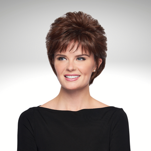 The Voluminous Crop wig is a short, all over layered cut that allows for varied styling options. The flattering eyelash bangs can be worn full or piecey, and the layered sides can be brought forward to frame the face or combed back to blend into a softly-waved, full back and nape for light and airy volume. Whether worn tousled or smooth, this versatile cut exemplifies cool and easy styling. Just a firm shake and a bit of finger styling right out of the box and it’s ready to go!